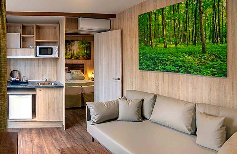 This bungalow comes with a double bedroom and a twin bedroom, each room has a TV. There is a living room with a sofa, microwave, mini-fridge and coffee and tea facilities. A 40 inch TV is included. The bungalow also has heating and air conditioning. The bathroom has a shower.
